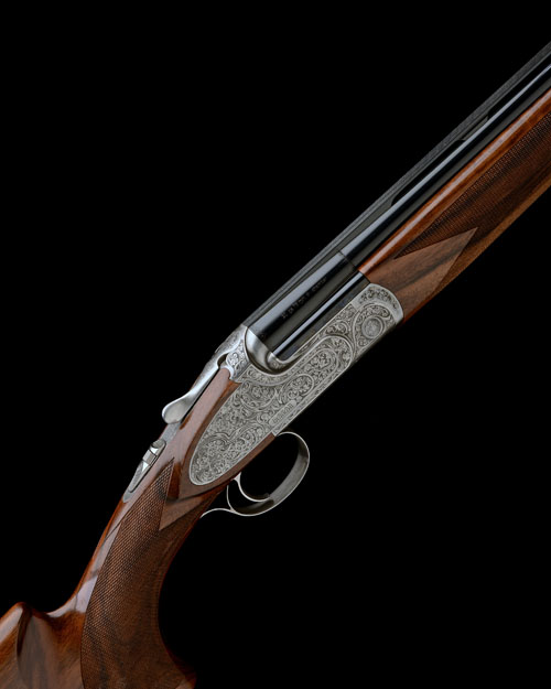 32in. nitro barrels with ventilated mid-ribs and 10mm ventilated matt top-ribs, one set 2 3/4in. chambers, the other 3in., multi chokes (with spares), hold-open toplever, automatic safety with integral barrel selector switch, engraved with bold flowing acanthus scrollwork on a matt background, the decorative sideplates engraved en suite, bright finish, 14 3/4in. pistolgrip stock including 3/4in. ventilated rubber recoil pad, weight 7lb. 8oz., in its makers universal case