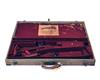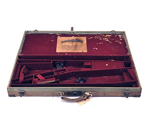 A BRASS CORNERED GREEN CANVAS DOUBLE GUNCASE, suitable for 28in. small bore barrels, the interior lined with red baize (moth damage), brass lock (including key), the lid interior with a 'CHARLES & H. WESTERN' trade label, the exterior with the initials 'B.K.'