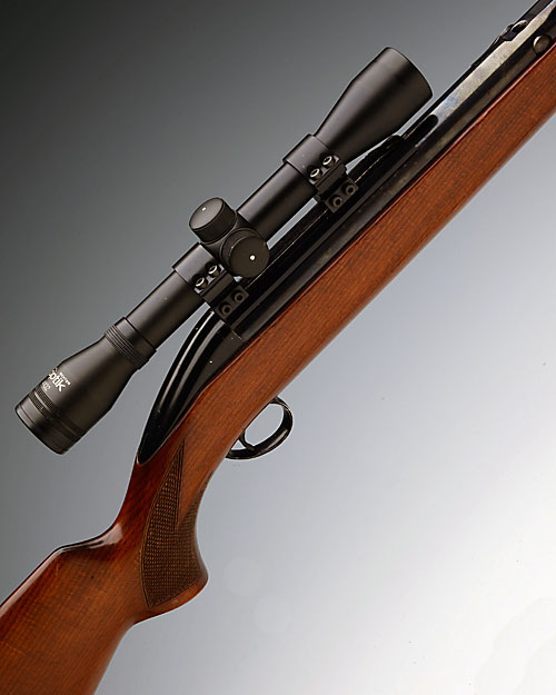 A .22 UNDER-LEVER AIR-RIFLE SIGNED BSA, MODEL 'AIRSPORTER STUTZEN MKI' serial no. GR00245, circa 1995, with 17 1/2in. blued barrel including attached sound-moderator, plain air-chamber with 'maxi-grip' telescopic sight rail, beech full-stock with rose-wood fore-end cap and fitted with a 'RICHTER OPTIK' 4x32 telescopic sight