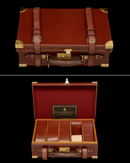suitable for approx. 250 cartridges, the interior lid lined with red baize and with a 'HOLLAND & HOLLAND' trade label, brass lock (including key), four removable dividers, five leather lifters