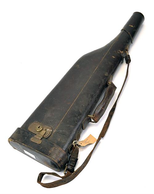 A LEATHER LEG-OF-MUTTON GUNCASE, suitable for 30in. barrels, the interior lined with canvas, brass lock (key missing)