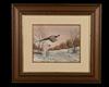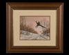 a set of two original signed acrylic on board showing a pheasant in flight in a winter setting, signed 'Mark Chester', with 'LIFTING OFF' and 'OVER TRACK', an original painting by Mark Chester' inscribed on the backs of each, both in matching dark wood frames