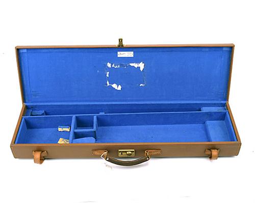 A 'BRADY' TAN LEATHER SINGLE GUNCASE, suitable for 29in. barrels, the interior lined with blue baize, brass lock (key missing), the exterior lid with the monogram 'R.P.J.'