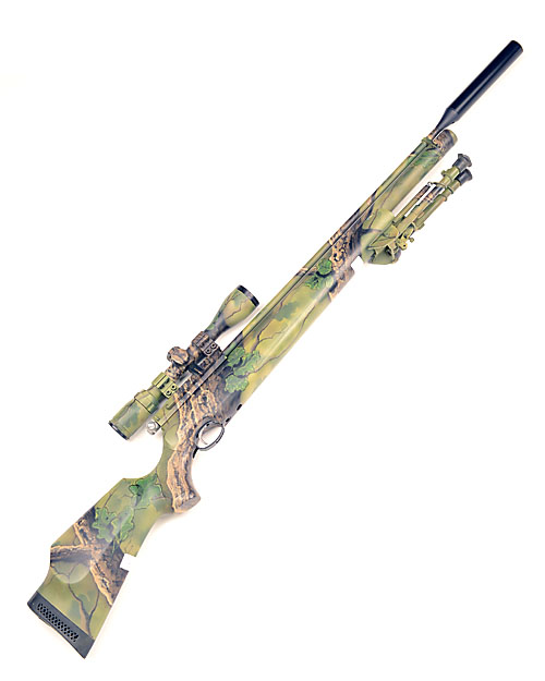 A .22 PRE-CHARGED PNEUMATIC REPEATING AIR-RIFLE SIGNED AIR-ARMS, MODEL 'S310 LTD EDITION', serial no. 3390, circa 2000, one of a limited edition run of 28 hand-painted camouflaged rifles, with 30 1/2in. barrel including attached sound moderator, alloy receiver with 10-shot magazine, right hand wood half-stock and fitted with a 'HARRIS' bipod and a 'BUSHNELL' 3-9x40 telescopic sight, the whole except the moderator painted in a unique realistic camouflage pattern, TOGETHER WITH a cordura nylon padded gun-bag