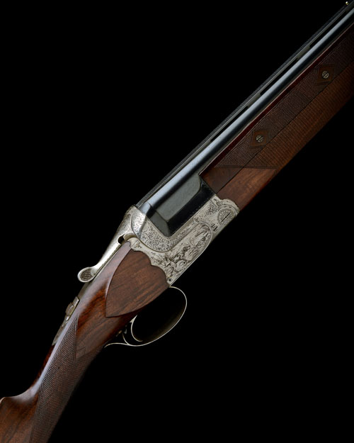 28 1/2in. nitro barrels with 7mm ventilated matt top-rib with intermediate bead, 2 3/4in. chambers, bored approx. true cyl and imp. cyl. choke, three-piece fore-end, bolstered scallop back action, manual safety, selective single trigger, acanthus scroll engraving, the sides engraved with a scene of a hound on point in a wetland setting, the underside with a vignette of a nye of pheasants, the triggerguard with a flushed mallard, silver finish, 14in. stock including 1/2in. ventilated rubber recoil pad, weight 7lb. 7oz.