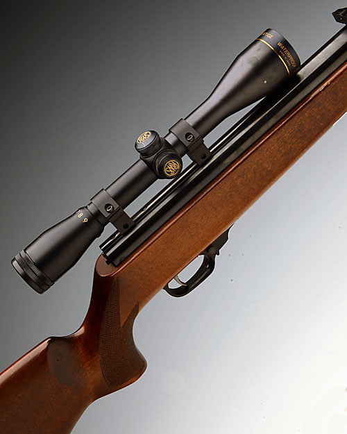 A .22 GAS-RAM BREAK-BARREL AIR-RIFLE SIGNED WEIHRAUCH, MODEL 'HW90', serial no. 264484, recent, with 25in. built-on two-stage sound-moderator, blued air-chamber, beech half-stock and fitted with sling-swivels, TOGETHER WITH an 'RWS PRESTIGE' 3-9x40 telescopic sight and mounts
