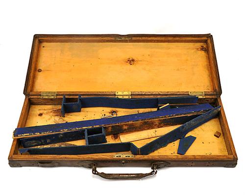 A BRASS-CORNERED OAK AND LEATHER DOUBLE GUNCASE, boxing missing, the interior measurements 29 1/in. x 10in.