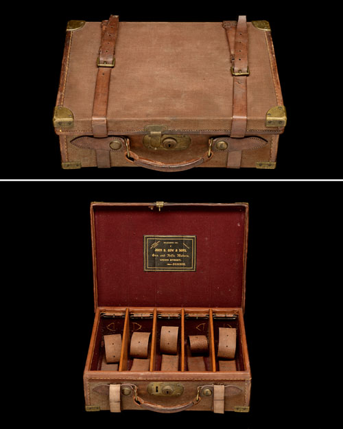JOHN R. GOW & SONS A BRASS-CORNERED CANVAS AND LEATHER CARTRIDGE MAGAZINE,