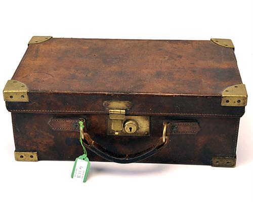 A LEATHER CARTRIDGE MAGAZINE, brass cornered with brass lock (key missing) , lifters and dividers missing