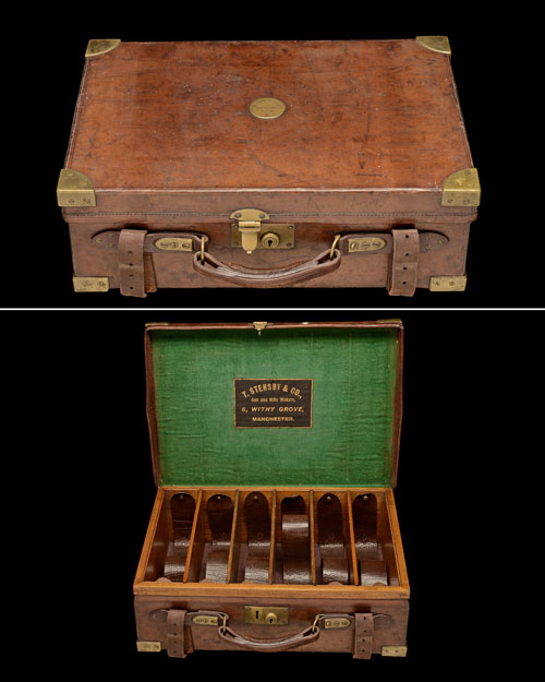 to hold approx. 600 cartridges, brass lock (key missing), five removable oak dividers, six leather lifters, the lid interior lined with green baize and with a leather gold tooled 'T. STENSBY & CO 6, WITHY GROVE MANCHESTER' trade label, the exterior lid with a brass escutcheon engraved 'W.B. SAGAR-MUSGRAVE. BACHELORS CLUB. W.'