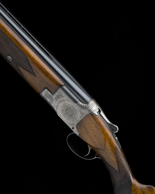 26in. nitro barrels with 8mm ventilated matt top-rib, 2 3/4in. chambers, bored approx. true cyl. in both, hold-open toplever, manual safety with integral barrel selector switch, gold-washed single trigger, bouquet and scroll engraving, silver finish, 14in. semi-pistolgrip stock including buttplate, weight 7lb. 5oz.