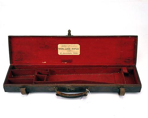 A 'JAMES WILSON' LEATHER SINGLE ROOK RIFLE CASE, suitable for 27in. barrel, the interior lined with red baize, brass lock (key missing), the lid interior with a 'JAMES WILSON' trade label