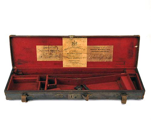 A 'WESTLEY RICHARDS' BRASS-CORNERED LEATHER SINGLE GUNCASE, suitable for 28in. barrels (could adapt to 30in.), the interior lined with red baize, brass lock (key missing), the lid interior with a 'WESTLEY RICHARDS' trade label, a 'WESTLEY RICHARDS Instructions for Using' label, a 'WESTLEY RICHARDS Instructions for Cleaning' label, handle needs attention