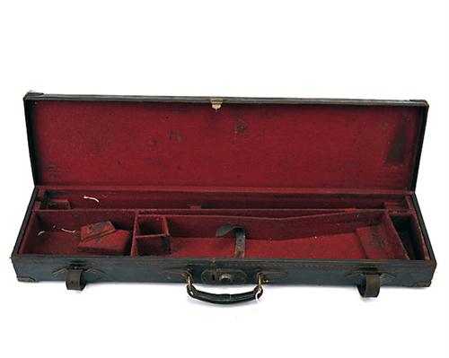 suitable for 29 1/2in. barrels, the interior lined with maroon baize, brass lock (key missing), the exterior lid with the monogram 'A.R.F.M.'