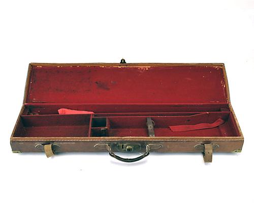 A BRASS-CORNERED LEATHER SINGLE GUNCASE, suitable for 30in. barrels, the interior lined with red baize, brass lock (key missing)