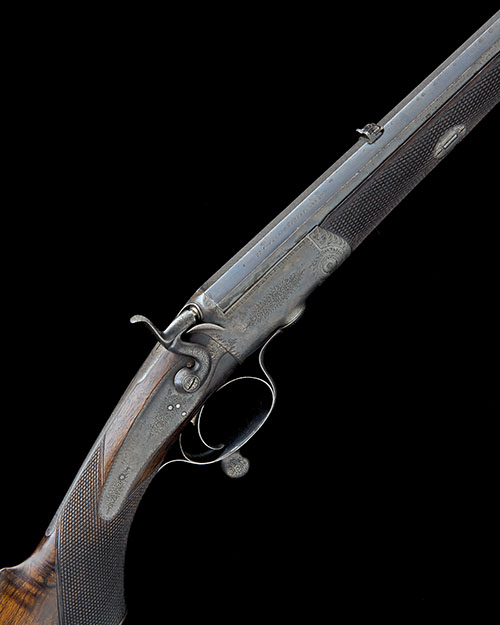 28in. octagonal barrel with matt sighting flat, bead fore-sight and rear-sight of one standing and two folding leaves calibrated for 60 and 100 yards, each with gold-inlaid centre-lines, the top planes engraved 'J. LANG & SONS. 22. COCKSPUR STREET. LONDON.', Jones-patent rotary underlever, non-rebounding back-action curved lock, fine border and scroll engraving, retaining very slight traces of original colour-hardening and finish, 14 1/4in. pistolgrip stock with engraved steel pistolgrip cap, the stock with a circular escutcheon bearing 'D' surmounted by the coronet of a Viscount, the fore-end with cross-pin release and horn finial