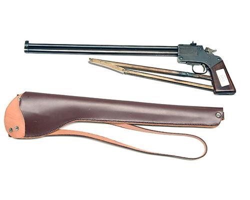 A .22(LONG) & .410 (2 1/2in.) COMBINATION PISTOL SIGNED MARBLES, MODEL GAME-GETTER GUN, serial no. 19401, with blued 15in. over-under barrels, blued break-open receiver, central hammer action with selector on the hammer nose and smooth walnut grips complete with folding stock (repaired) and a leather holster