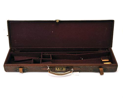 A SINGLE LEATHER GUNCASE, suitable for suitable for 30in. barrels, the interior lined with burgundy baize, brass lock (key missing)