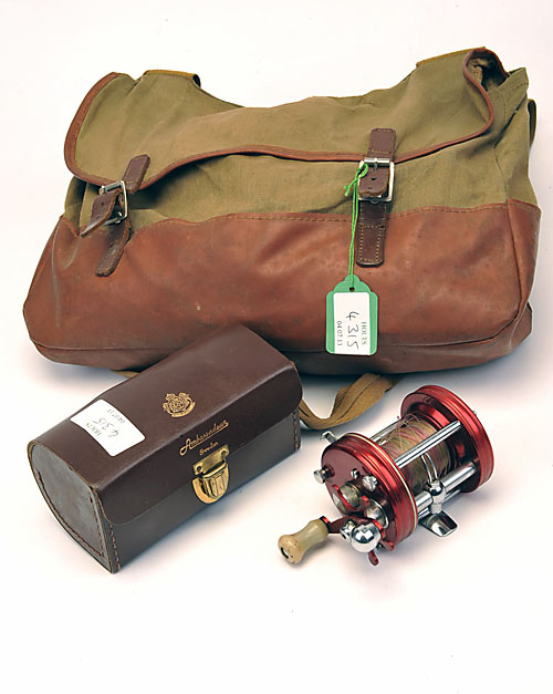 A FISHING BAG WITH VARIOUS LOOSE ITEMS OF TACKLE, including an Ambassadeur 6000 Swedish fishing reel, an intrepid reel, fishing line, lures, hooks and weights (QTY)