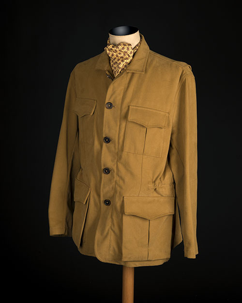 single-vented jacket with shoulder pleats, horn button and zip fastening to the neck at the front, drawcord waist adjuster, two inside pockets, four expandable outside flap pockets and with characteristic detachable shoulder carrier