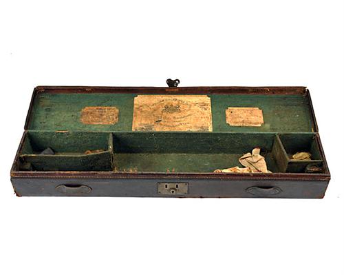 A 'WILLIAM ROCHESTER PAPE' LEATHER SINGLE GUNCASE, suitable 30in. barrels, the interior lined with green baize, brass lock (key missing), the lid interior with a 'WILLIAM ROCHESTER PAPE, trade label, the exterior lid embossed with 'W.A. FREEMAN, NEW CASTLE'