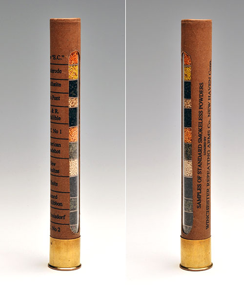 in the form of an over-length 12-bore shotgun cartridge with celluloid window, the buff paper body printed 'SAMPLES OF STANDARD SMOKELESS POWDERS LOADED BY WINCHESTER REPEATING ARMS CO, NEW HAVEN CONN. IN "LEADER", "REPEATER", "NEW RIVAL" AND "NUBLACK". and containing twelve different named powder samples separated by card wads