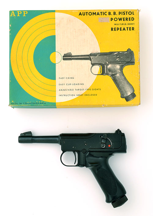 A BOXED .177 CO2 POWERED REPEATING AIR-PISTOL SIGNED 'SLAVIA', MODEL 'APP 661', serial no. 12904, circa 1970, with blued tapering 4 1/2in. barrel, black painted alloy receiver and plastic chequered grips, TOGETHER WITH its makers card carton and instructions, the whole appearing unused