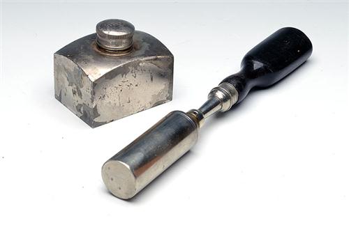 A NICKEL OIL-BOTTLE AND A CHAMBER-BRUSH, the first of rectangular form and signed on the lid 'A & N C.S.LD, LONDON (slightly deformed, mild losses to plating), the second a horn handled white-metal plated example signed 'G. & J. W. HAWKSLEY' and marked for 12-bore
