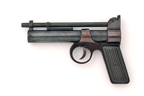 A .177 BARREL-COCKING AIR-PISTOL SIGNED WEBLEY, MODEL 'JUNIOR MKI', serial no. J3021 pre war circa 1931, with smooth-bore 6 1/2in. barrel, adjustable rear-sight (damaged), blued air-chamber with makers details and model, blacked ribbed tin-plate grips, mild losses and discolouration to finish