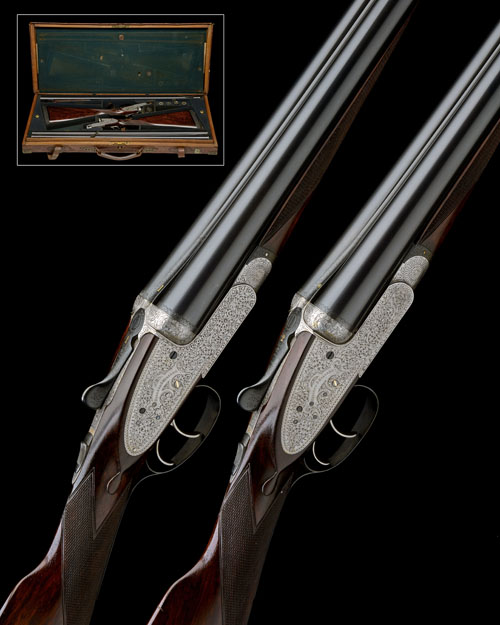 30in. nitro barrels, the tubes engraved 'HOLLAND & HOLLAND. 98. NEW BOND STREET, LONDON' (No.2 wall thickness below recommended minimum) and the ribs engraved with flashes of foliate scroll and gold-inlaid '1' and '2' at the breech ends, 2 1/2in. chambers, bored approx. true cyl. and 1/4 choke (both), toplevers gold-inlaid '1' and '2 respectively, automatic safeties with gold-inlaid 'SAFE' details, gold-inlaid cocking-indicators, best border and acanthus scroll engraving, brushed bright and blued finish, 15in. figured stocks including 1in. rubber recoil pads, weight 6lb. 11oz. (No.1) 6lb.12oz (No.2), in their brass-cornered oak and leather double guncase with internal protective flap