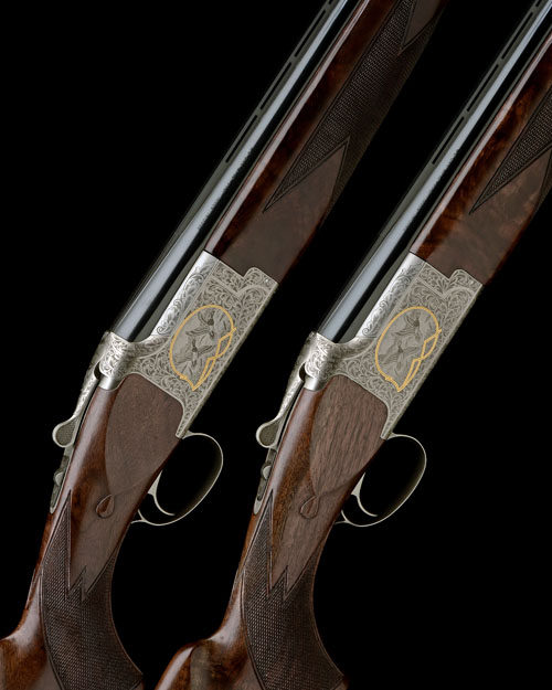28in. nitro barrels with 6mm ventilated matt top-ribs, 3in. chambers, multi chokes (with spares), hold-open toplevers, manual safeties with integral barrel selector switches, foliate bead and scroll engraving, central gold line cartouches with vignettes of pheasants and duck in flight, old silver finish, 14 3/4in. highly-figured pistolgrip stocks including buttplates, weight 7lb. 7oz., in a new Parsons fleece-lined soft leather double gunslip (will separate to individual slips) and with paperwork