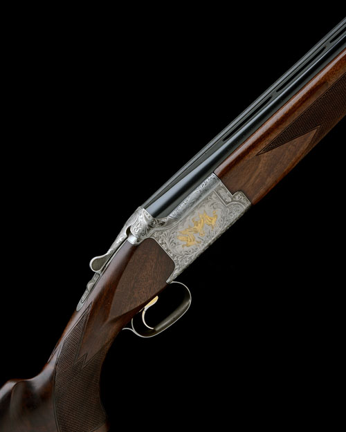 28in. nitro barrels with 13mm ventilated matt top-rib, 2 3/4in. chambers, multi chokes (with spares), hold-open toplever, manual safety with integral barrel selector switch, gold-washed adjustable trigger, foliate scroll engraving surrounding gold-highlighted scenes of pheasant, duck and hound, bright finish, 14 1/2in. figured pistolgrip stock (cracked and repaired) including 5/8in. rubber recoil pad, weight 7lb. 8oz., in a universal case