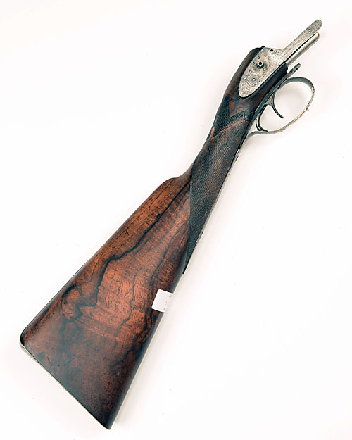 SOME PARTS OF A CONVERTED PURDEY 12-BORE HAMMERGUN, possible serial number 4367 conversion from muzzle loading, barrels (already cut in accordance to proof house memo regarding sale as a Stock, Action and Fore-end only) stamped with number 4367, rib damaged, un-numbered lockplates signed 'PURDEY', missing hammers and action and fore-end, bowed triggerguard worn (no visible number), steel buttplate with back strap, stock broken