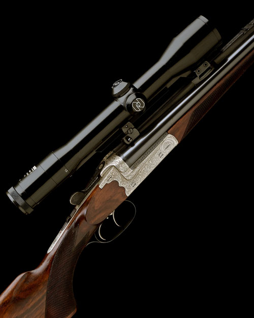 23 5/8in. Bohler Rasant-steel nitro chopperlump barrels with raised matt rib, flip-up open sights and bead fore-sight, the underside with Josef Hambrusch initials, the breech end mounted with a Zeiss Diavari-Z 1.5...6x42T* telescopic sight in quickly-detachable mounts, scroll-back treble grip action with side-bolsters, removable striker discs, manual safety, set front trigger, fully engraved with bold stylised acanthus scrollwork on a matted background, bright and blued finish overall, 14 1/4in. figured pistolgrip stock with sling swivels and including 1/2in. rubber recoil pad, weight 8lb. 9oz.