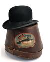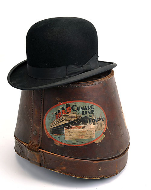 A VINTAGE BOWLER HAT COMPLETE WITH LEATHER STORAGE BOX, made by J. Moores & Sons Ltd of London, the hat box displaying a Cunard Line to Europe label sailing on the RMS Aquitania from New York to Southampton First Class. Complete with brass strap and brass lock (key missing)