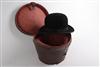 A VINTAGE BOWLER HAT COMPLETE WITH LEATHER STORAGE BOX,