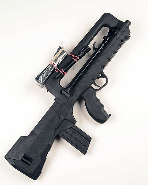 A SCARCE .177 (BB) CO2-POWERED REPEATING AIR-RIFLE SIGNED 'FAMAS', no visible serial number, recent, in imitation of the assault rifle of the same name, abs plastic construction, complete with six spare magazines and a barrel extension