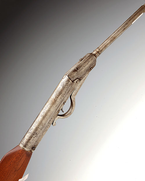 A .25 BREAK-BARREL AIR-RIFLE, SIGNED 'PATENT', MODEL 'GIANT PATTERN GEM' serial no. 5013, circa 1900, with 21 1/4in. two-stage sighted barrel, plain air-chamber, replaced butt and trigger-guard forming the cocking link, finish worn