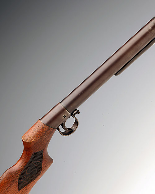 A .177 BREAK-BARREL AIR-RIFLE SIGNED BSA, MODEL 'BREAK-BARREL', serial no. B2653, for 1936, with 18 1/4in. barrel (open sights modified), plain air-chamber (no traces of etching), walnut saw-gripped butt-stock, traces of finish