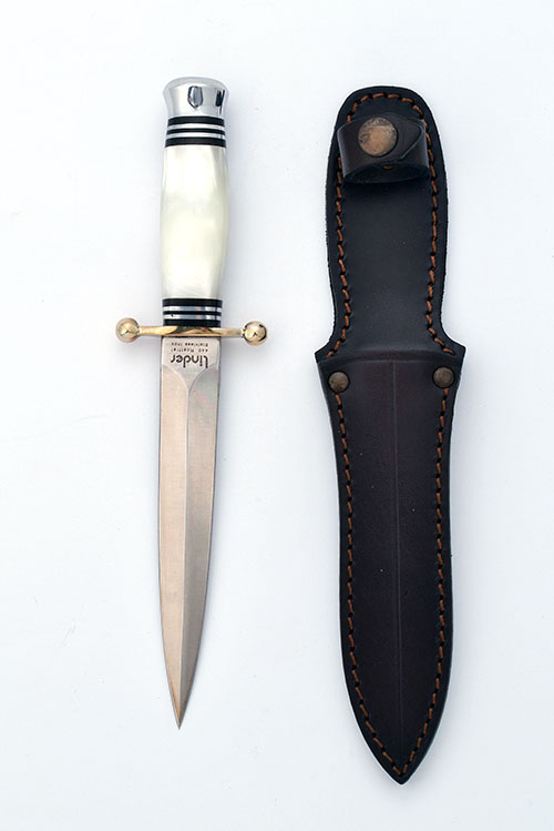A CARL LINDER PERLEX DAGGER KNIFE, with white perlex handle, double guard and pommel. The speer point blade being made from 440 A stainless steel and measuring 6 in. in original leather sheath. In manufacturers carton