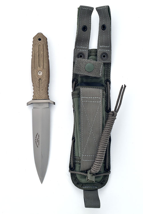 A BOKER APPLEGATE FAIRBAIRN 5.5 HARSEY KNIFE, featuring the bead blasted 440C high performance steel blade. The extended tang doubles as a glass-breaker, and the CNC machined handles, crafted of green canvas Micarta, are extremely durable and comfortable, providing a secure grip even in wet conditions. This piece comes complete with a foliage green premium tactical sheath, manufactured by Spec-Ops Brand (USA), which can be mounted in various positions and has a pouch on top, for other gear (such as a multi-tool). Blade length: 5 1/2 in. together with manufacturers carton