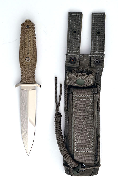 A BOKER APPLEGATE-FAIRBAIRN 5.5 HARSEY LIMITED EDITION KNIFE, this Limited Edition No.35 features a two-tone blade finish and a mirror polished handguard, the blade is made of X-15 T.N. steel. The extended tang doubles as a glass-breaker, and the CNC machined handles, crafted of green canvas Micarta, are extremely durable and comfortable, providing a secure grip even in wet conditions. This piece comes complete with a foliage green premium tactical sheath, manufactured by Spec-Ops Brand (USA), which can be mounted in various positions and has a pouch on top, for other gear (such as a multi-tool). Blade length: 5 1/2 in. together with manufacturers carton