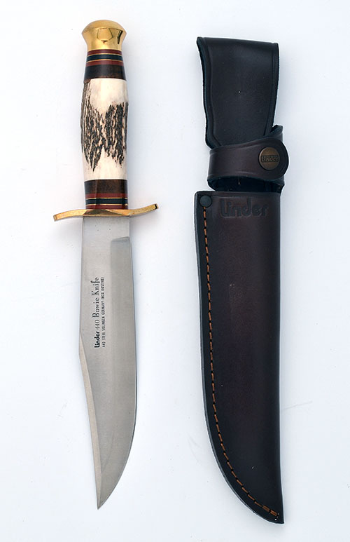 A CARL LINDER ORIGINAL STAG HANDLED BOWIE KNIFE, measuring almost 8" with 440 stainless steel blade, genuine stag handle with brass hand guard and pommel. High quality leather belt sheath together with manufactures carton