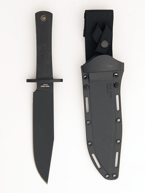 A COLDSTEEL RECON SCOUT KNIFE, with a 7 1/2in. carbon steel blade with black Teflon finish. Chequered black Kraton handle, Lanyard hole, Black Secure-Ex sheath together with manufacturers carton