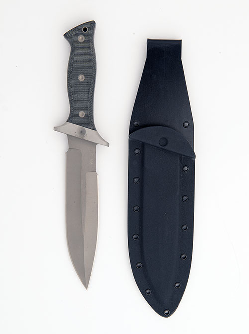 AN ENTREK USA MERC KNIFE, with a 6 1/2 in. 440C double edged stainless steel blade , aluminium guard with a green canvas effect micarta handle and lanyard hole, with a black Kydex sheath with a belt loop all complete in manufacturers carton