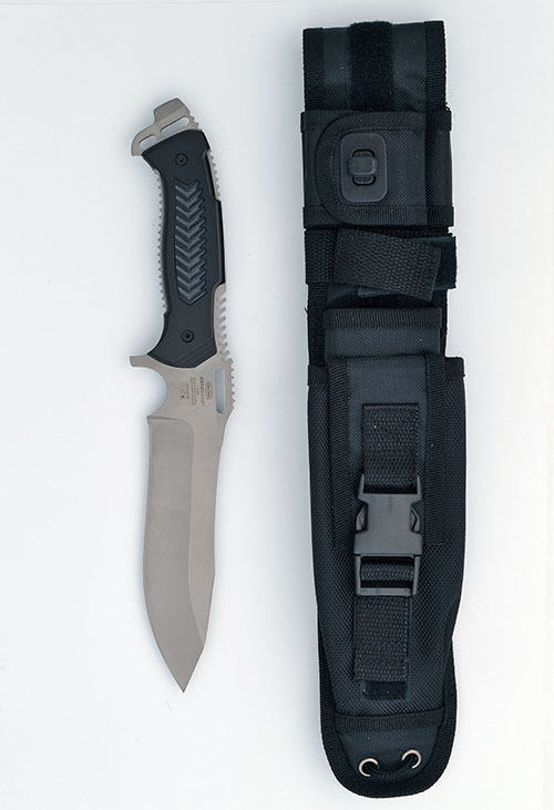 AN UZI DEFENDER ELITE TOP OF THE RANGE FIXED BLADE KNIFE, with a 5 1/2 in. stainless steel blade with a non reflective bead blast finish , shark tooth tip , pronounced finger coil and notched thumb rest. The exposed tang has integral lanyard slots and prying tool, together with a black reinforced nylon tactical sheath all contained in manufacturers carton