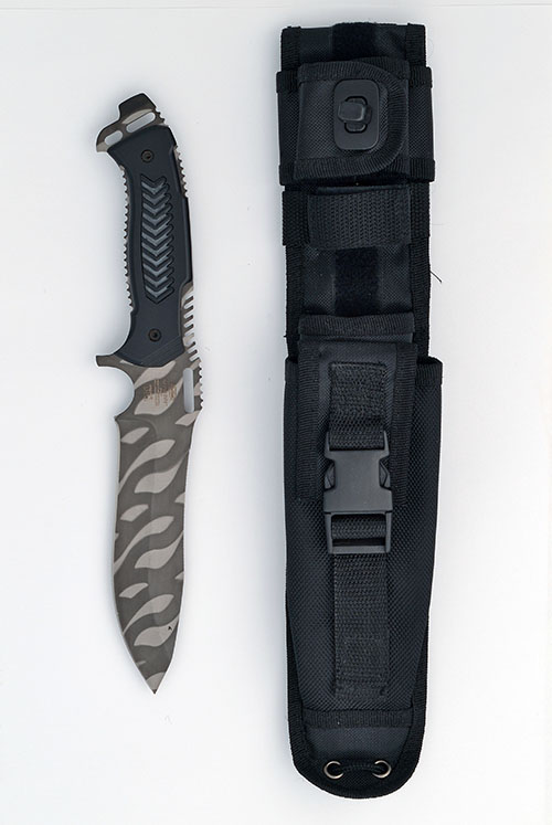 AN UZI DEFENDER FIXED BLADE CAMO KNIFE, with a 5 1/2 in. stainless steel camo blade , shark tooth tip , pronounced finger coil and notched thumb rest. The exposed tang has integral lanyard slots and prying tool, together with a black reinforced nylon tactical sheath all contained in manufacturers carton