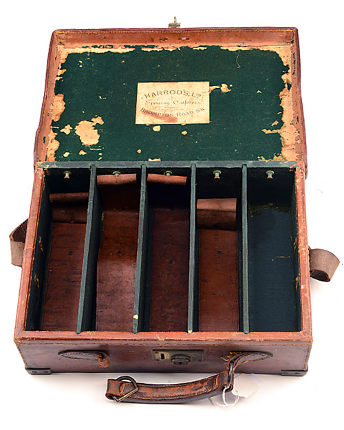 BRASS CORNERED LEATHER CARTRIDGE MAGAZINE, for approx. 250 cartridges, the interior lid lien with green baize (moth damage) & with a 'HARROD'S Ltd BROMPTON ROAD. S.W.) trade label, the box lined with green canvas, four removable dividers, five leather lifters (one missing), brass lock (key missing)