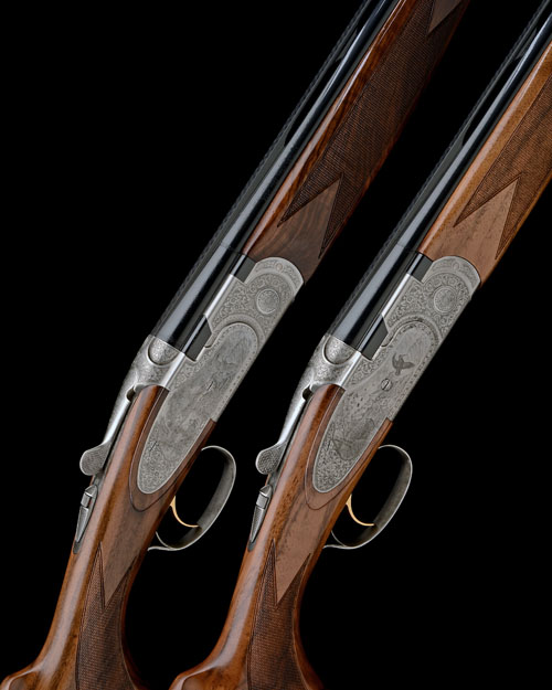 29 1/2in. nitro barrels with 6mm ventilated matt top-ribs, 3in. chambers, bored approx. imp. cyl. and 1/4 choke, hold-open toplevers, automatic safeties with integral barrel selector switches, gold-washed triggers, floral and scroll engraving, the decorative sideplates with game scenes of pheasant and woodcock, triggerplates signed 'Bottega C Giovanelli', bright finish, 14 3/4in. well-figured pistolgrip stocks including 5/8in. rubber recoil pads, weight 6lb. 2oz. and 6lb. 6oz.