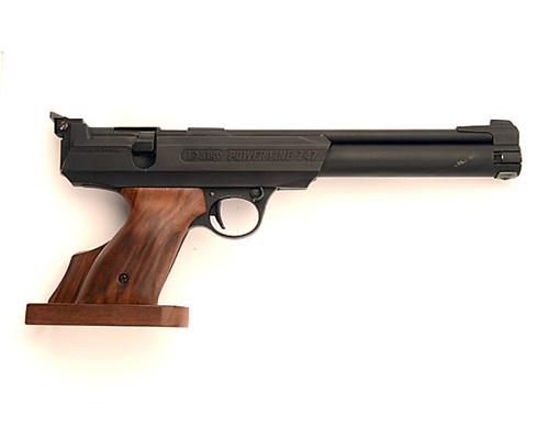 A .177 SINGLE-STROKE PNEUMATIC TARGET AIR-PISTOL SIGNED DAISY, MODEL '747', serial no. 6M00414, with blacked 9 1/2in. barrel, bolt action receiver. side-mounted cocking-lever and anatomical right hand walnut grip